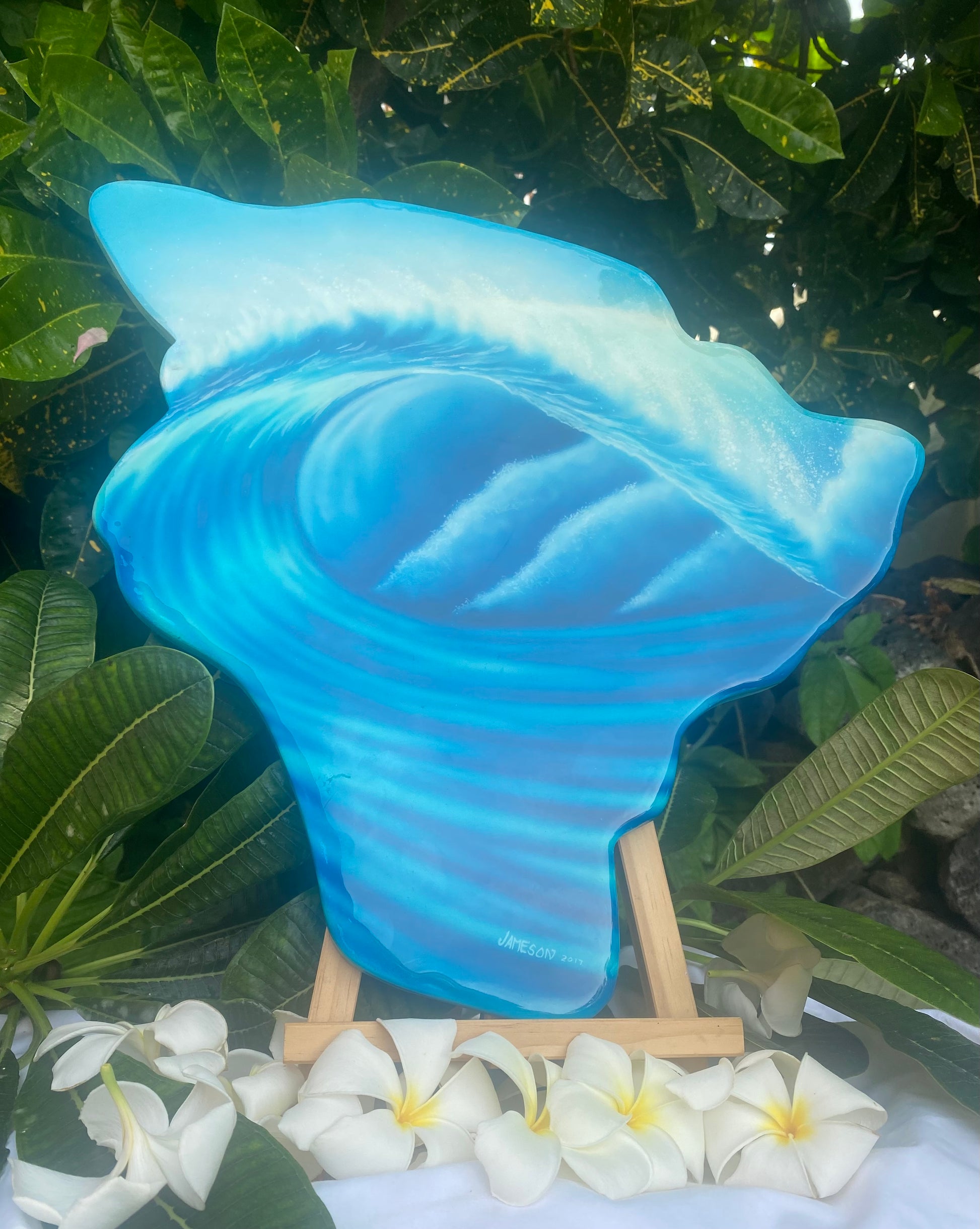 Acrylic airbrushed painted, hand carved Big Island and coated in top of the line epoxy resin. Gloss finish. Roughly 18x20 inches