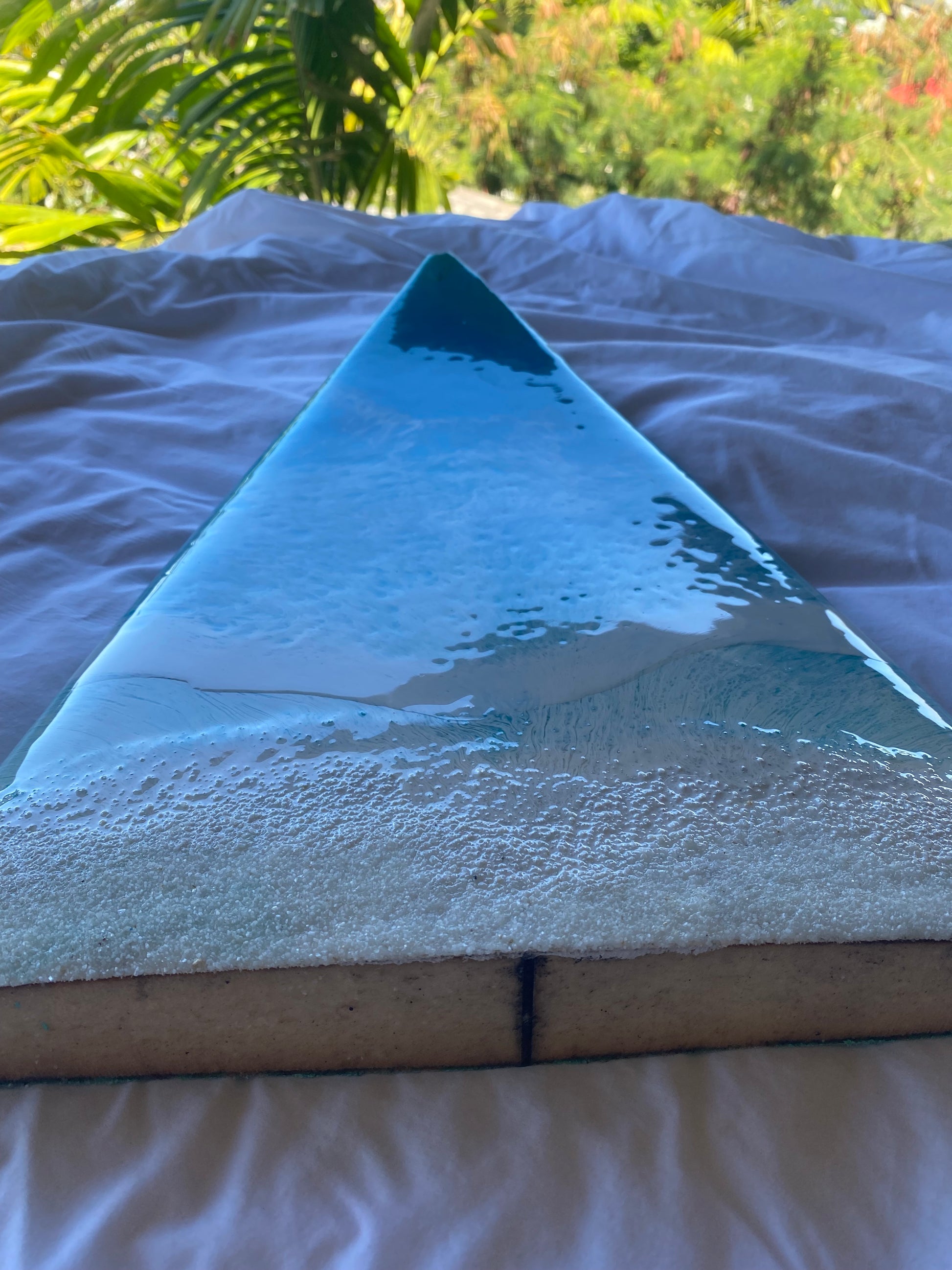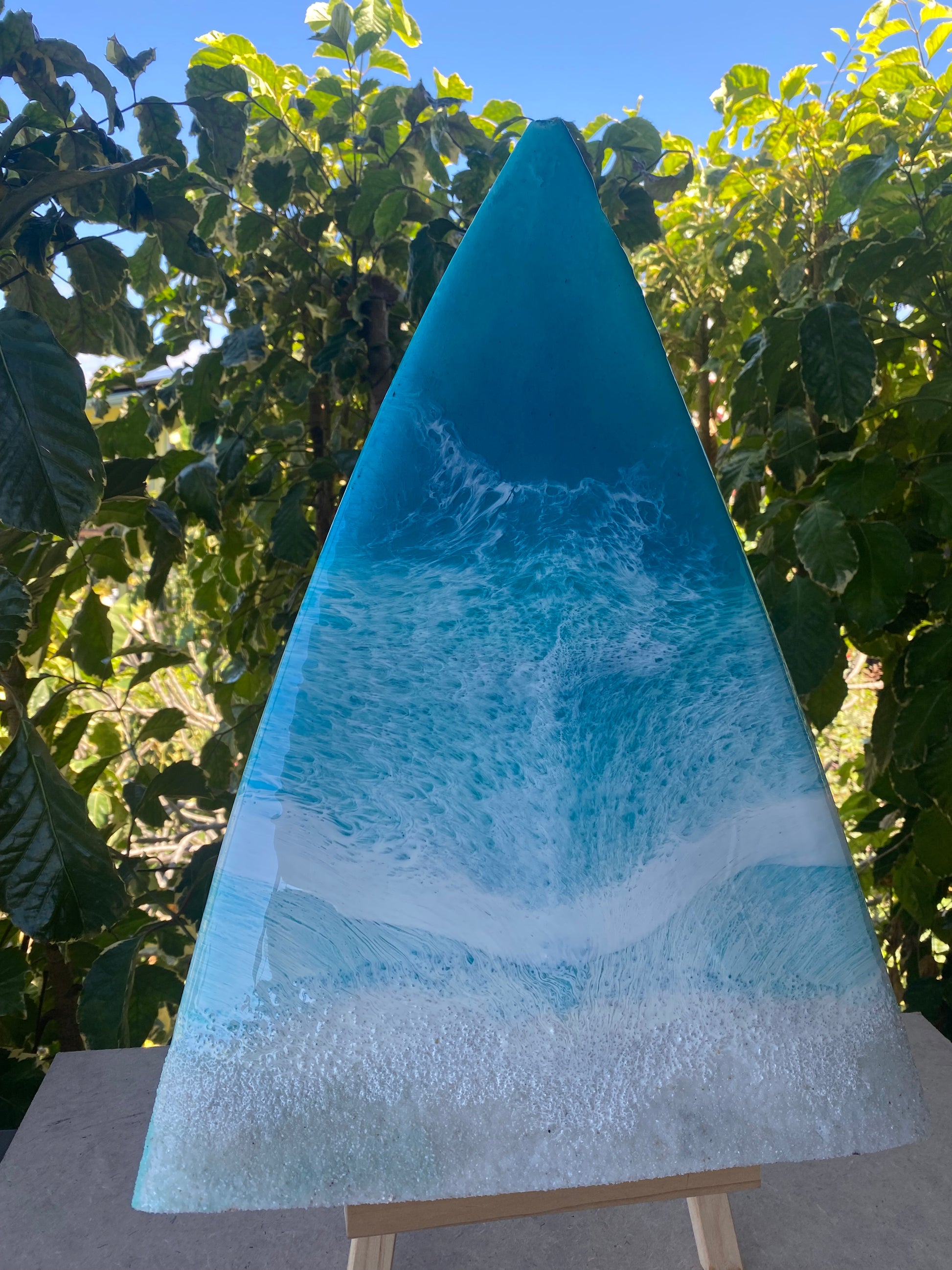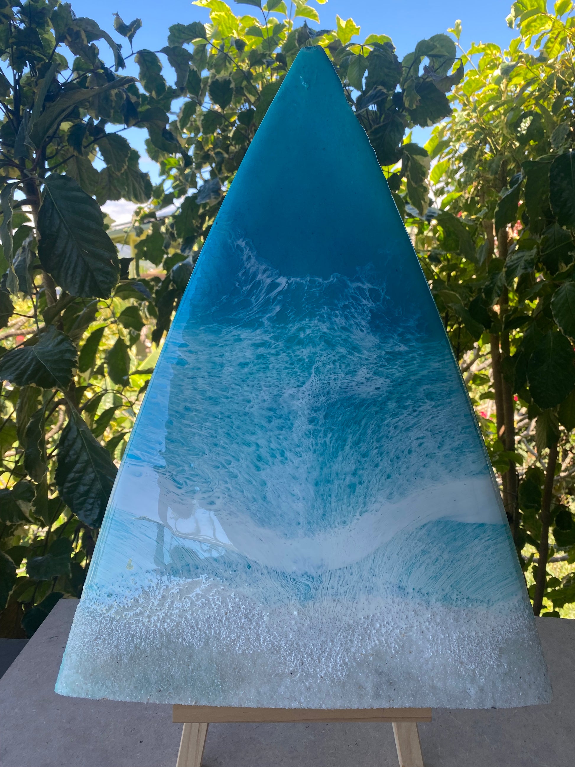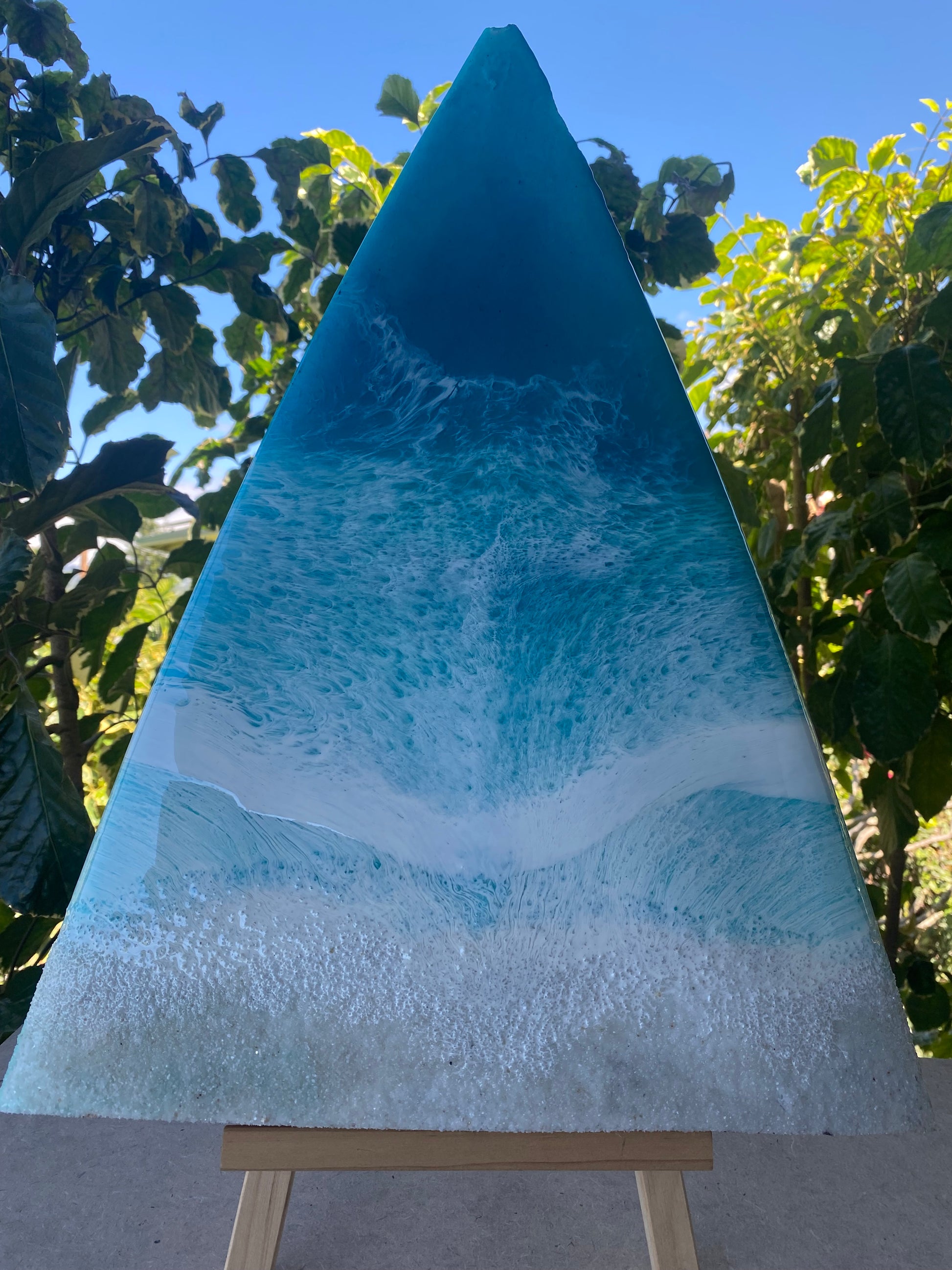 created with high quality paints, pigments and epoxy resin. Created on the nose of a broken surfboard.