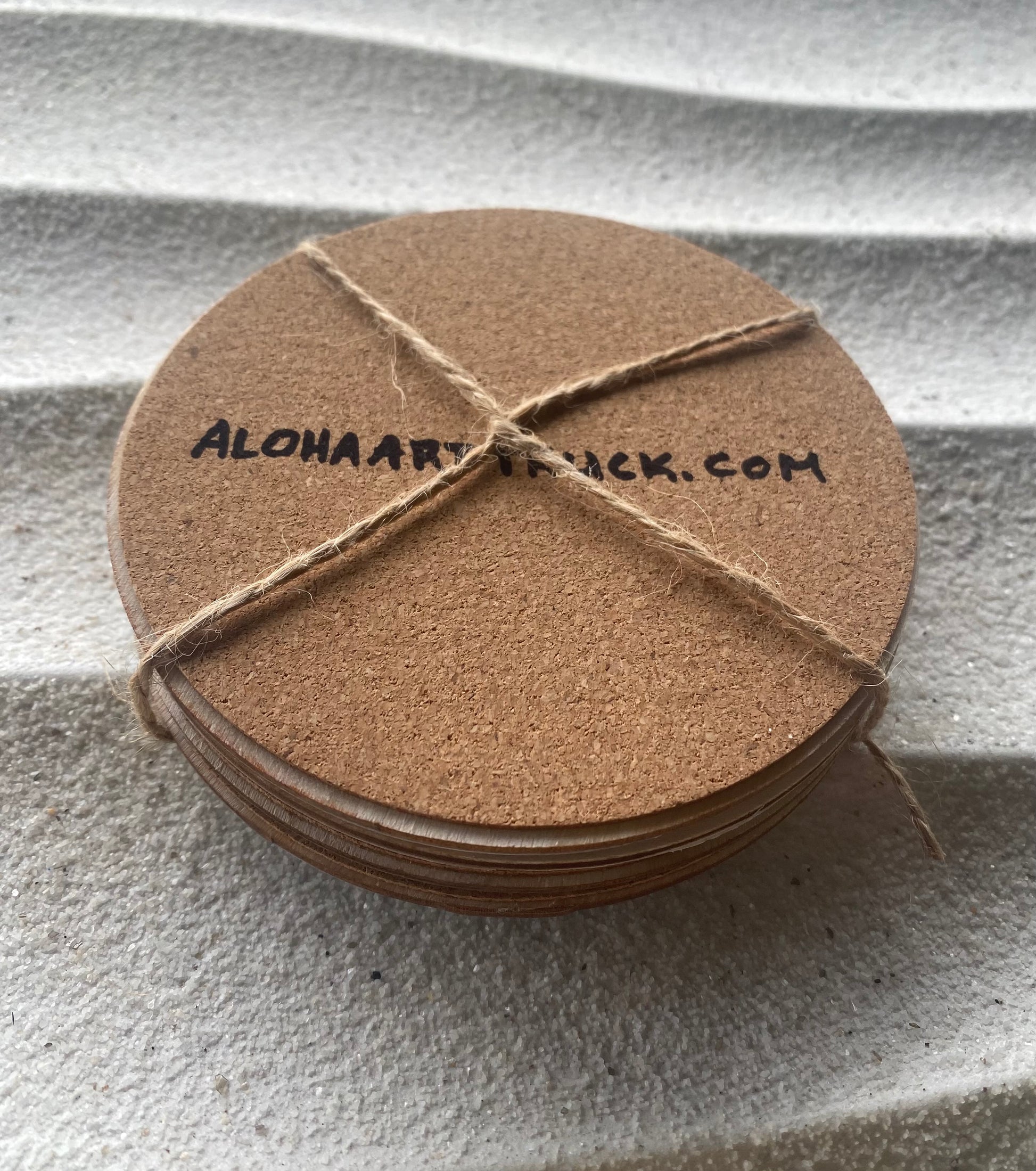 Plumeria print wood coasters with cork bottom. Set of 4 matching