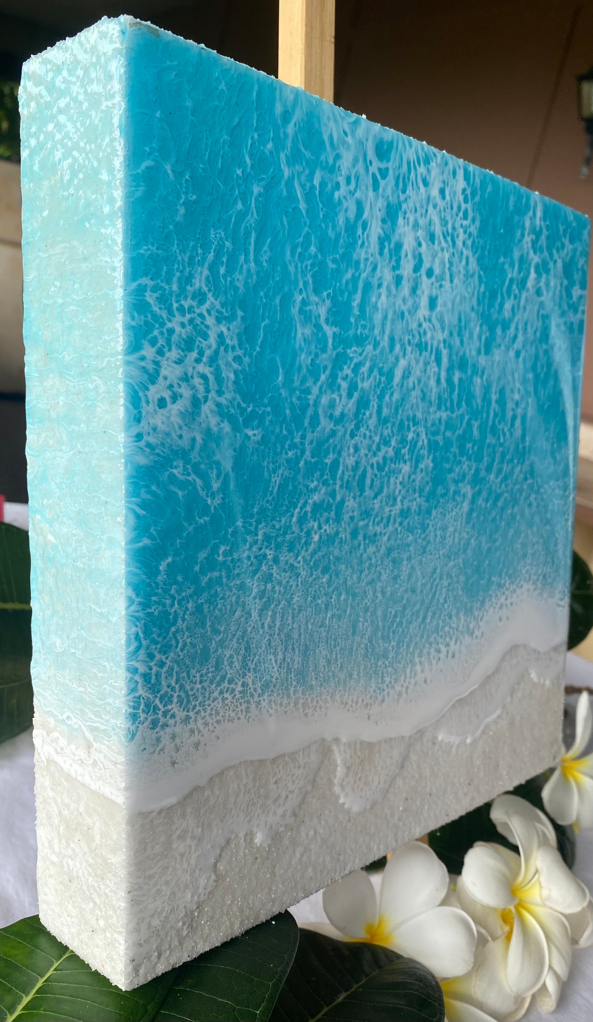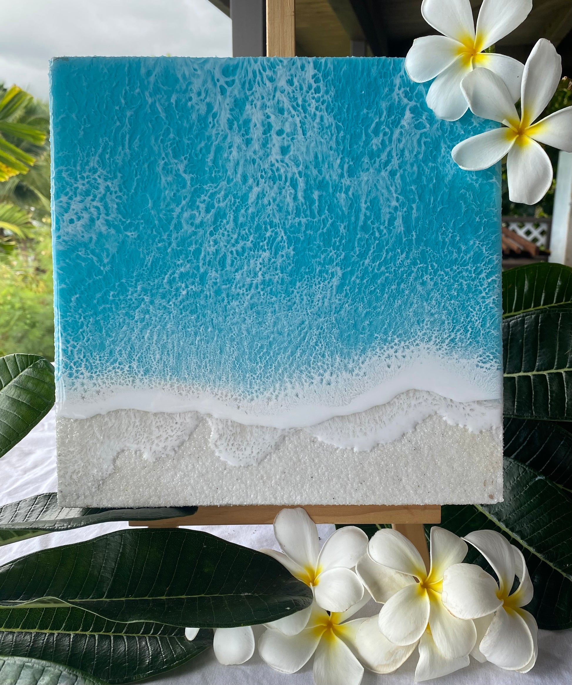 Inspired by Kailua beach on the Island of Oahu. This 10x10 painting created with top of the line Epoxy Resin has a very unique side to it, It has real sand edges that are 1-1/2 inches deep and the ocean flows down the sides over the sand.