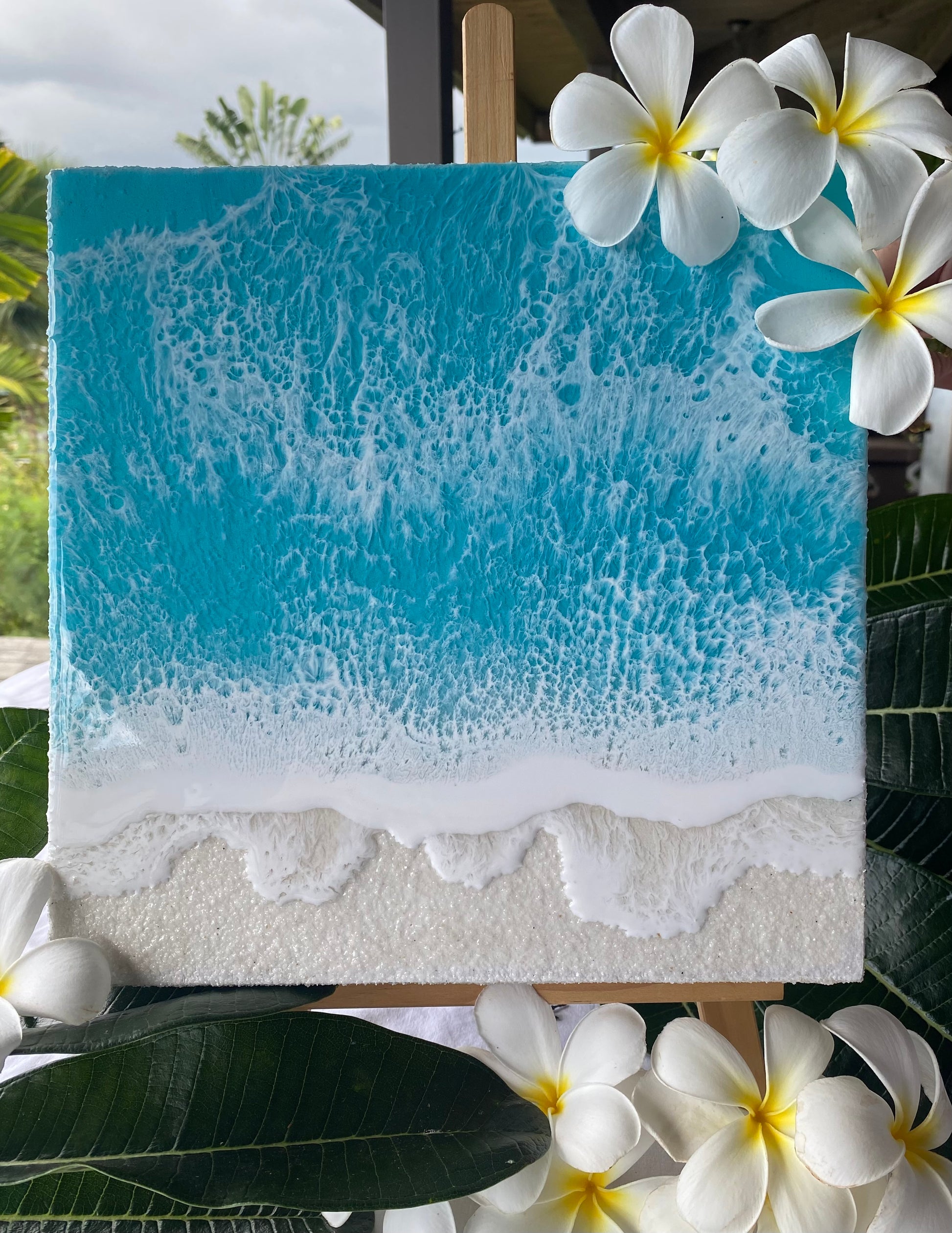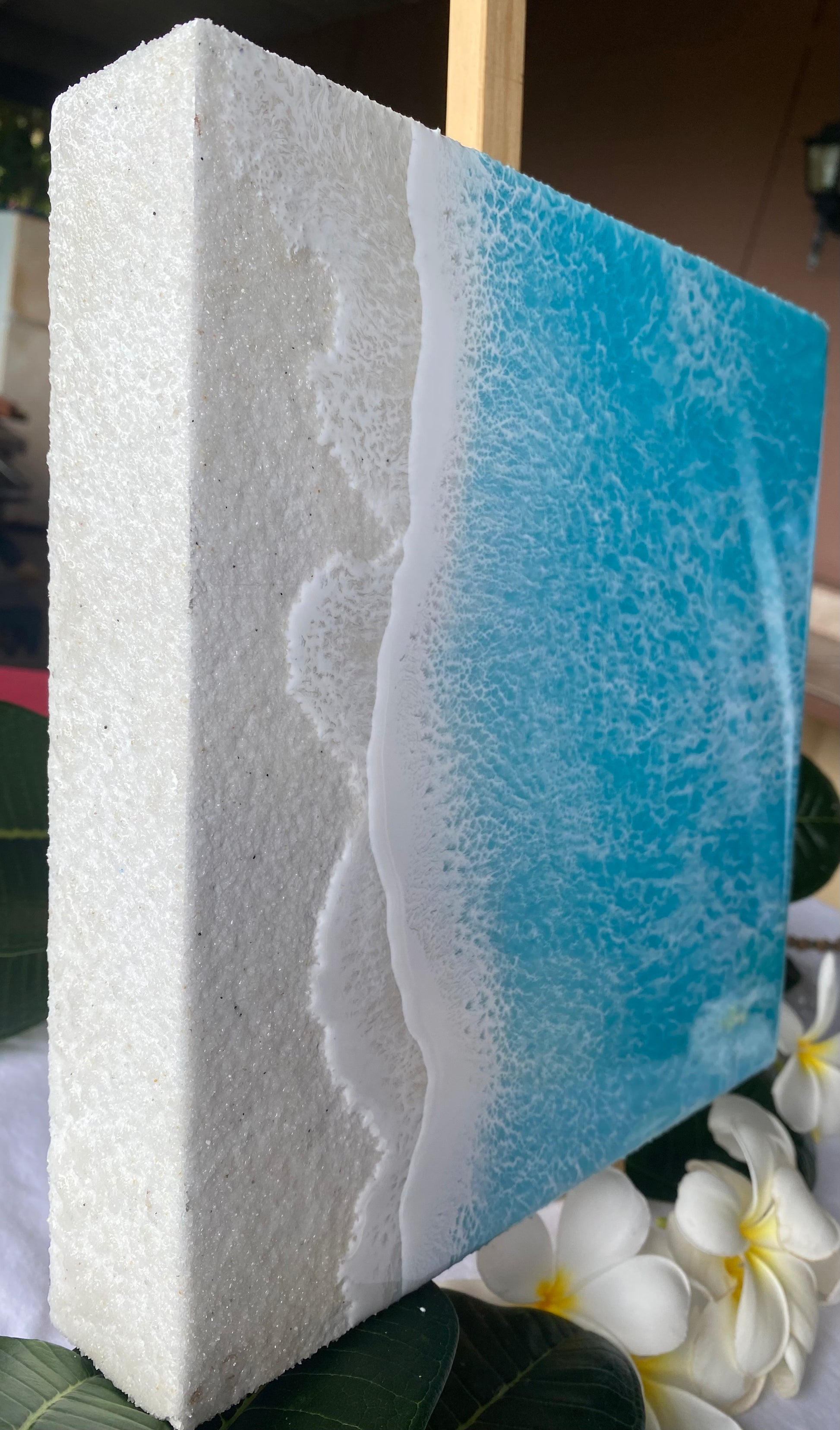 Inspired by Kailua beach on the Island of Oahu. This 10x10 painting created with top of the line Epoxy Resin has a very unique side to it, It has real sand edges that are 1-1/2 inches deep and the ocean flows down the sides over the sand.
